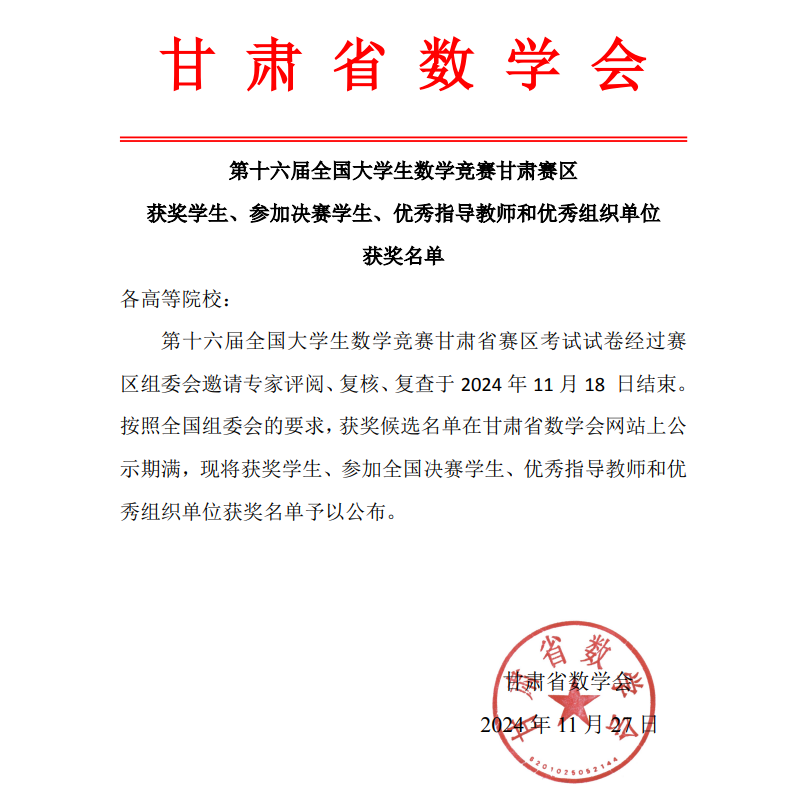 由中国数学会主办的2024年第十六届全国大学生数学竞赛(甘肃赛区)获奖名单近日揭晓。我校有101名同学喜获佳绩。数学专业B组获奖63项(其中一等奖16项,二等奖19项, 三等奖33项),非数学专业A组获奖33项(其中一等奖2项, 二等奖14项, 三等奖17项),数统学院2022级学生章惠娟进入全国决赛,我校获优秀组织奖。
